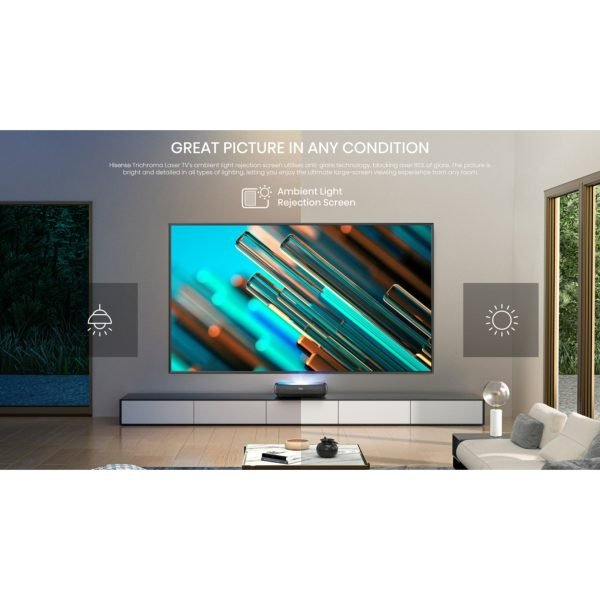 Hisense Trichroma Laser TV’s ambient light rejection screen utilises anti-glare technology, blocking over 85% of glare. The picture is bright and detailed in all types of lighting, letting you enjoy the ultimate large-screen viewing experience from any room..