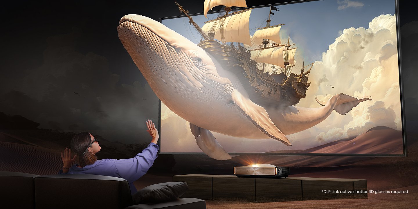 Simply place the projector in front of your screen or a blank wall—its cameras will automatically detect the position and calibrate everything for you.