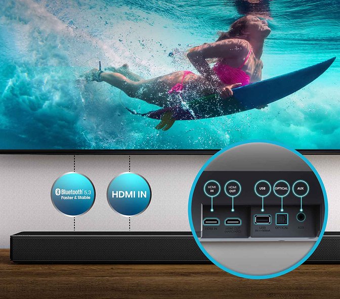 With HDMI OUT (eARC), the Hisense AX5120G Soundbar is easy to install and connect to your TV wirelessly through Bluetooth or using a single HDMI cable.
