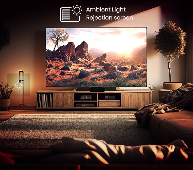 Hisense Trichroma Laser TV’s ambient light rejection screen utilises anti-glare technology, blocking over 85% of glare. The picture is bright and detailed in all types of lighting, letting you enjoy the ultimate large-screen viewing experience from any room..